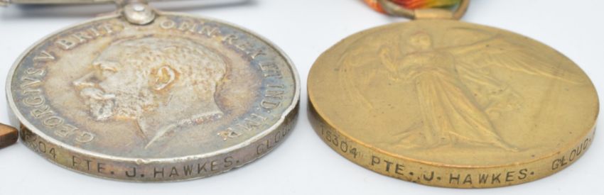 British Army WW1 medals comprising 1914/1915 Star, War Medal and Victory Medal named to 15304 Pte J Hawkes, Gloucestershire Regiment