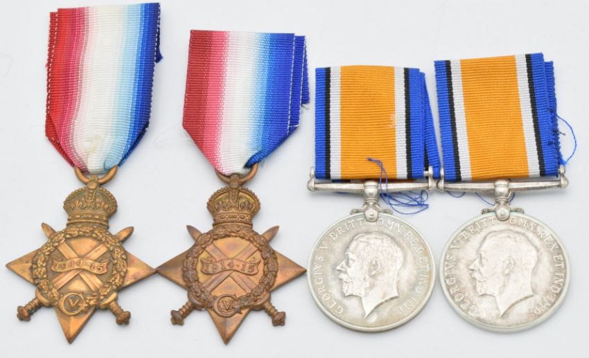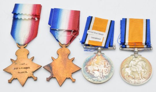 British Army WW1 medals comprising 1914/1915 Star named to 11687 Pte G Hanniss, Gloucestershire Regiment, killed in action at the Battle of the Somme on 30th July 1916, together with an unnamed 1914/1915 Star and two unnamed War Medals