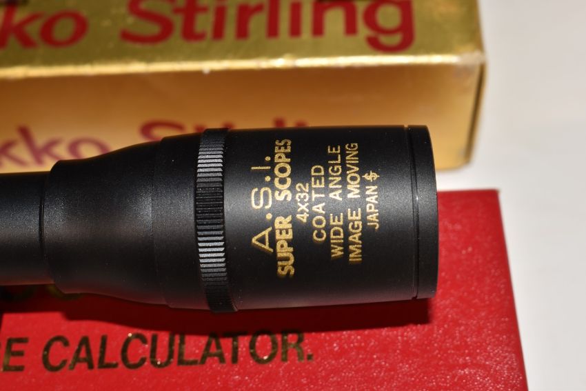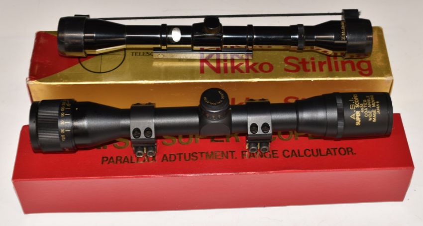 Two rifle scopes Nikko Stirling Tiara 4x28 and ASI Super Scope 4x32 wide angle, both in original boxes.