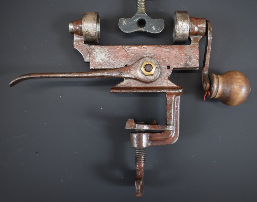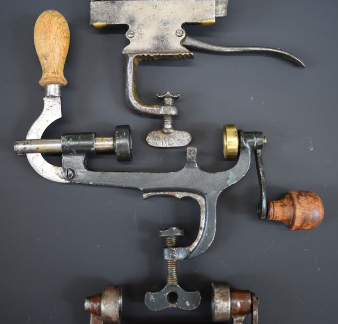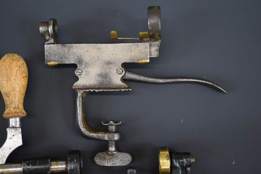 Three 16 bore shotgun cartridge rollover tools one stamped 'Brevete SGDG' one stamped 'DG' and one stamped 'Rapid'.