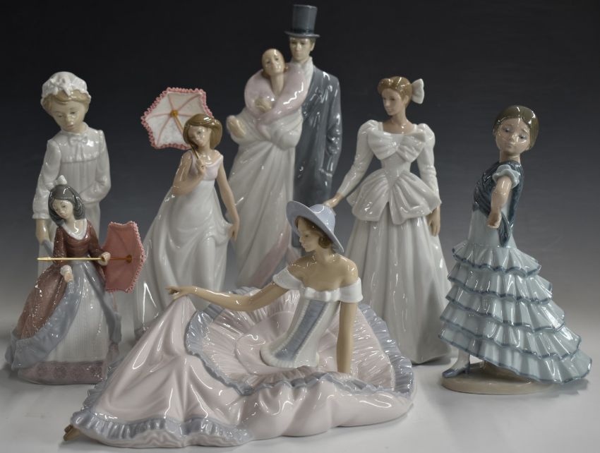 Six Lladro and Nao figures including sweethearts, girls with parasols etc