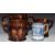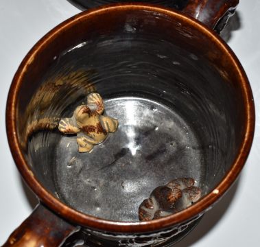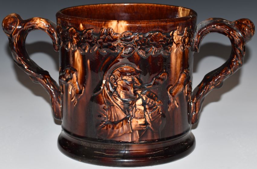 Three Rockingham oversized frog loving cups / tygs and a 19thC blue and white tankard, largest H22 diameter 21cm