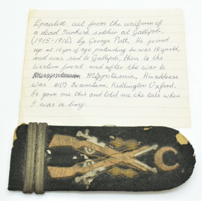 WW1 Turkish soldier's epaulette, by repute taken from a Turkish soldier at Gallipoli by George Putt, with handwritten note