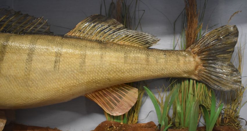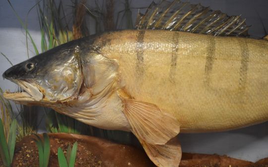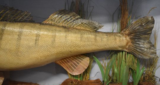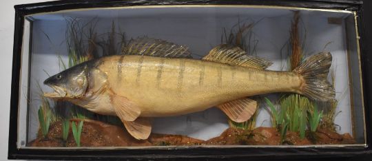Taxidermy study of a zander in glazed bow fronted case, taxidermist Robert Stuart, Aldershot, W90 x D20 x H38cm