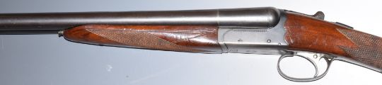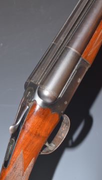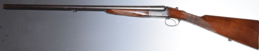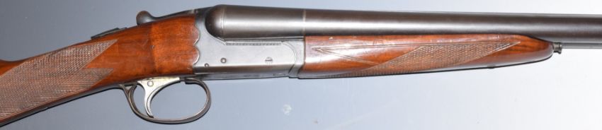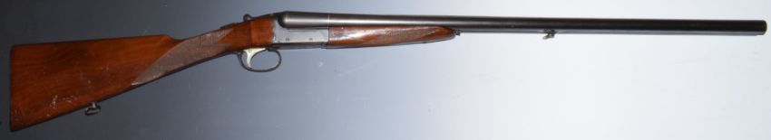 BSA 100 12 bore side by side shotgun with chequered grip and forend, single trigger, sling suspension loops and named 28 inch barrels choked ¼ and ¾, overall length 113cm, length of pull 36cm, serial number 168026. PLEASE NOTE THAT A VALID RELEVANT FIREARMS/SHOTGUN CERTIFICATE IS REQUIRED TO HANDLE/PURCHASE THIS ITEM.