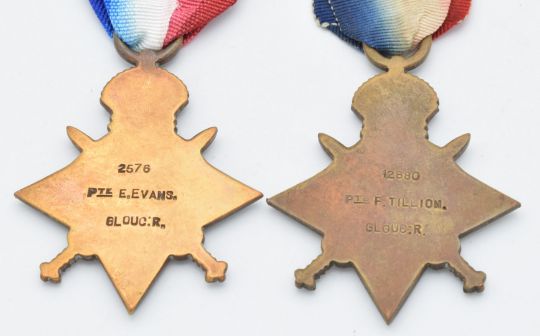 British Army WW1 medals comprising two 1914/1915 Stars named to 12680 Pte F Tillion and 2576 Pte E Evans, both Gloucestershire Regiment