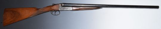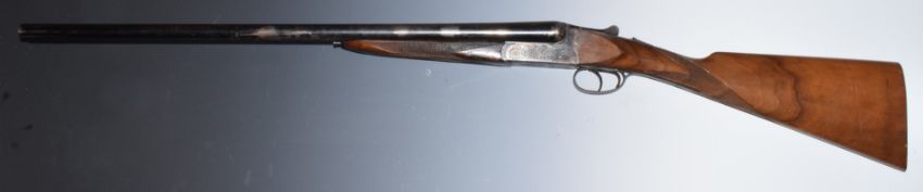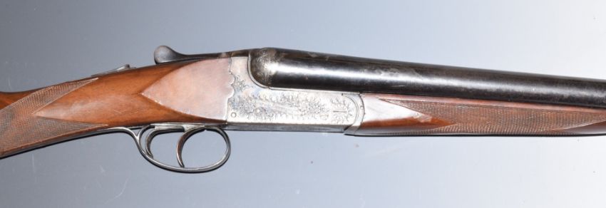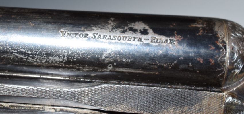 Victor Sarasquetta 12 bore side by side ejector shotgun with named and engraved locks, engraved top plate, top lever, underside, fences and trigger guard, chequered grip and forend, double trigger and named 26 inch barrels choked full and improved cylinder, overall length 108.5cm, length of pull 37cm, serial number 219802. PLEASE NOTE THAT A VALID RELEVANT FIREARMS/SHOTGUN CERTIFICATE IS REQUIRED TO HANDLE/PURCHASE THIS ITEM.