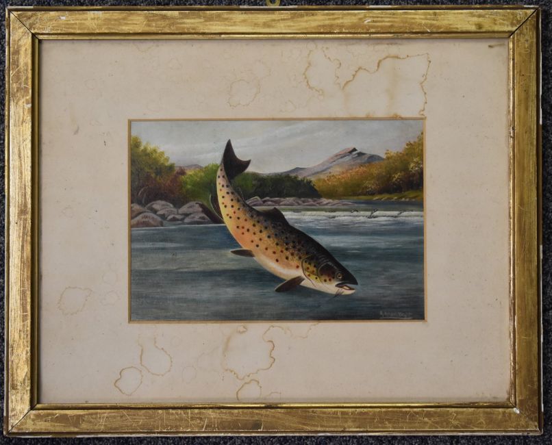 A. Roland Knight watercolour of a leaping fish caught on a line, with river landscape beyond, signed lower right, 16 x 24cm, in gilt frame
