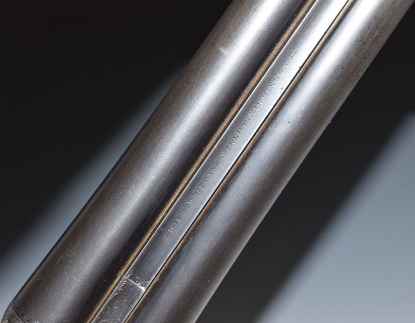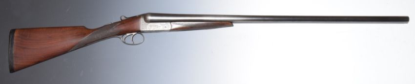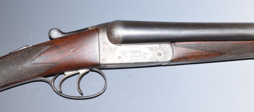 Thomas Wild 12 bore side by side shotgun with engraved scenes of birds to the named locks, engraved underside, trigger guard top plate, fences and thumb lever, chequered grip and forend, double trigger and named 30 inch barrels choked ½ and ¾, overall length 117cm, length of pull 35.5cm, serial number 15674. PLEASE NOTE THAT A VALID RELEVANT FIREARMS/SHOTGUN CERTIFICATE IS REQUIRED TO HANDLE/PURCHASE THIS ITEM.