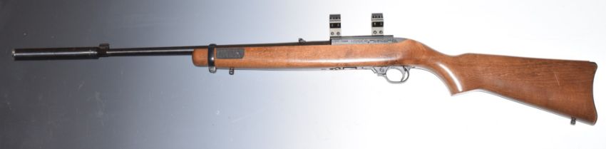 Ruger Model 10/22 .22 semi-automatic rifle with semi-pistol grip, magazine, sling suspension mounts, scope mounts, sound moderator and 25 inch barrel, overall length 110cm, serial number 247-25006. PLEASE NOTE THAT A VALID RELEVANT FIREARMS/SHOTGUN CERTIFICATE IS REQUIRED TO HANDLE/PURCHASE THIS ITEM.