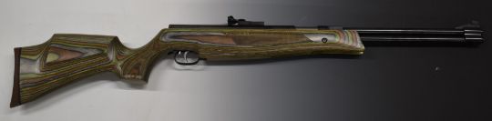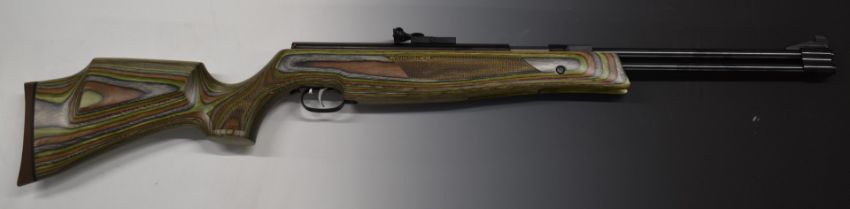 Weihrauch HW77 K .22 air rifle with laminated show wood stock, chequered semi-pistol grip and forend, adjustable sights and raised cheek piece, in original box.