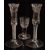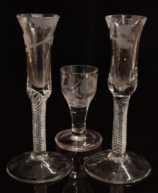 A pair of mid-18thC air twist stem glasses, the bowls etched with roses of Jacobean significance, approximately 17.5cm tall, together with a 19thC firing glass with etched decoration.