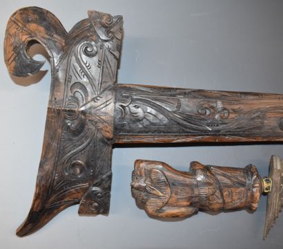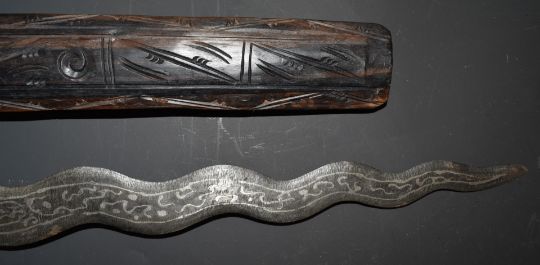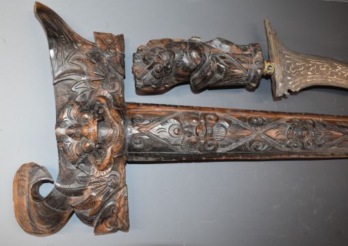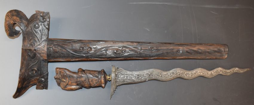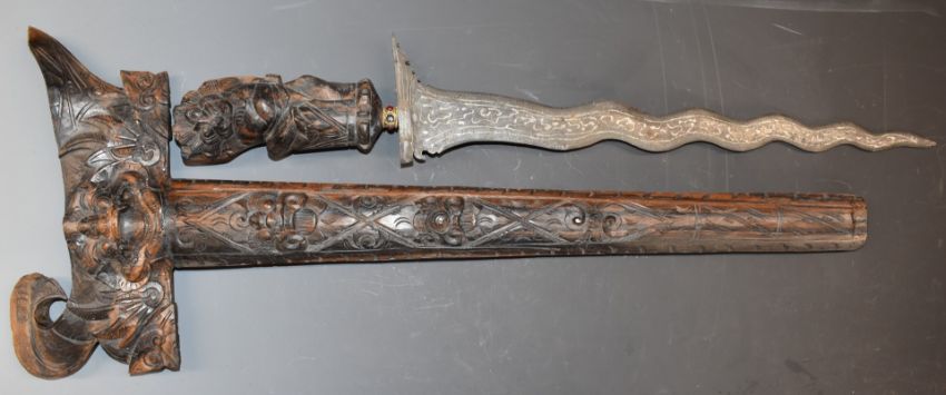 An eastern Kris dagger with 38cm blade, heavily carved handle and scabbard and glass inset gilt collar, overall length 53cm.