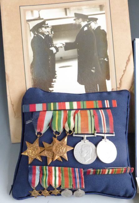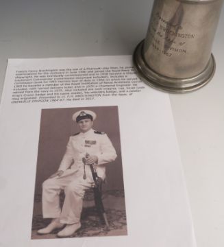 Royal Navy medals and ephemera relating to Francis Henry Brockington including WW2 medals comprising, 1939-1945 Star, Pacific Star, Italy Star, Defence Medal and War Medal with miniatures and ribbon bars, beret, rank insignia, framed commissioning document, qualification certificates, HMS Hermes Third Commission 1966-1968 souvenir book, USB stick containing photographs of his naval and family life etc. Francis Henry Brockington was the son of a Plymouth ship fitter, who passed his examinations for the dockyard in June 1940 and joined the Royal Navy to be a shipwright. He was eventually commissioned and in 1958 became Shipwright Lieutenant Commander, his commission document is included along with a commission book for HMS Hermes tour of duty in 1966 on which he served. In 1969 he became a member of the Royal Institution of Naval Architects (scroll included, with named delivery tube) and in 1970 a Chartered Engineer. He retired from the Navy in 1975. Also included are rank insignia, cap, beret (with King's Crown badge and his name inside), his veteran's badge and a pewter mug engraved: Presented to Lt F H Brockington from the Apps. of Grenville Division 1964-67. He died in 2017