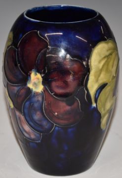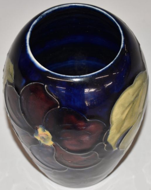 Moorcroft vase decorated in the Clematis pattern on blue ground, H13cm