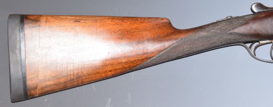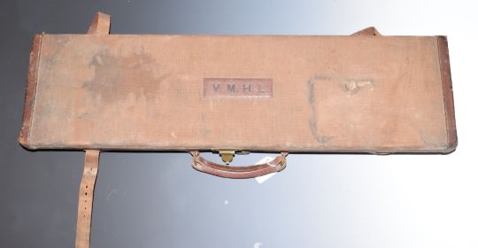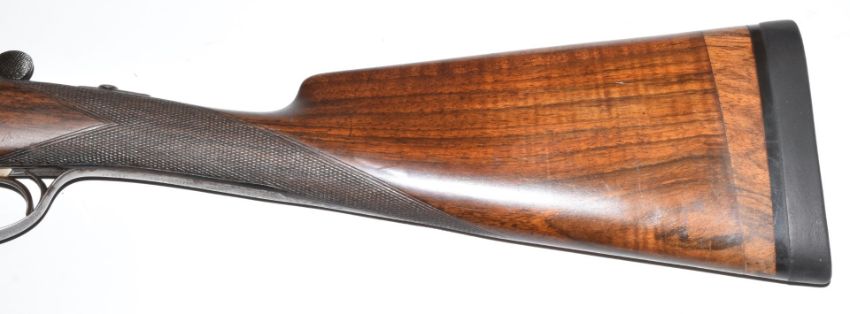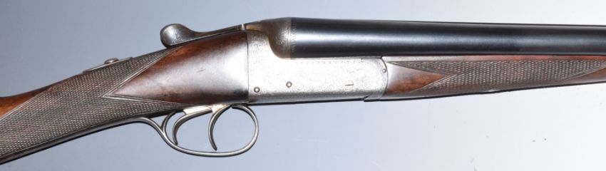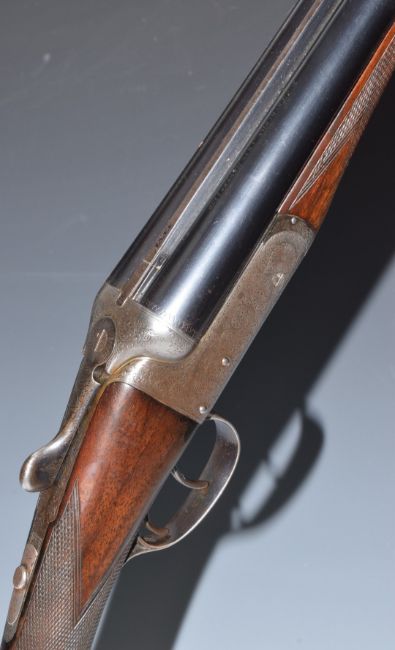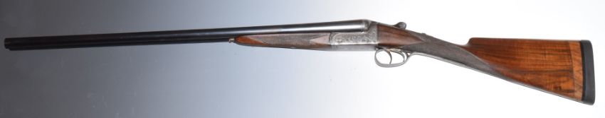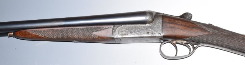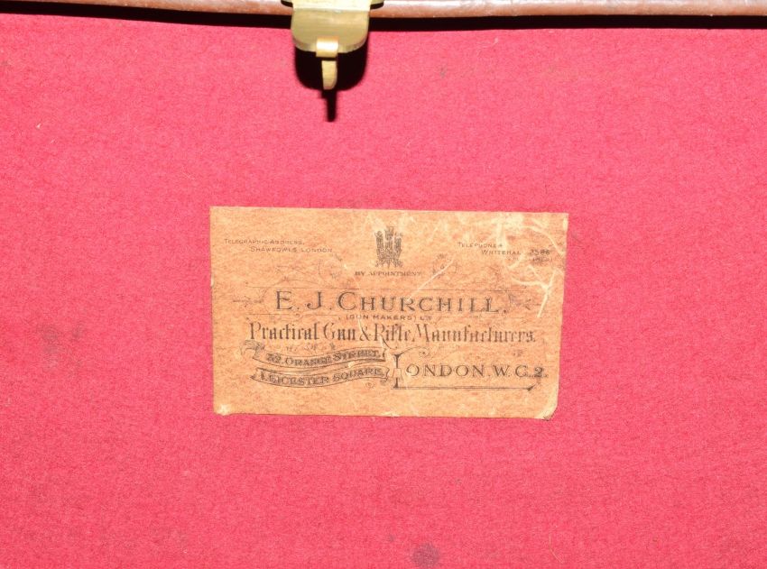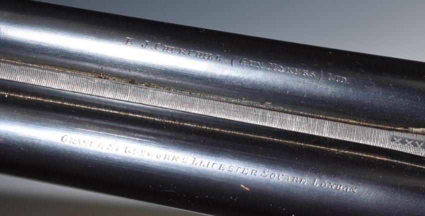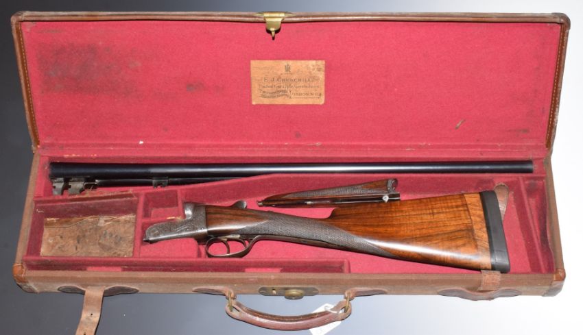 E J Churchill XXV 20 bore side by side ejector shotgun with named and engraved locks, engraved underside, trigger guard, top plate, fences and thumb lever, chequered grip and forend, double trigger and 25 inch barrels engraved 'E J Churchill (Gunmakers) Ltd Orange St Gunworks Leicester Square London', overall length 113cm, length of pull 35cm, serial number 5616, in canvas and leather case with original label. PLEASE NOTE THAT A VALID RELEVANT FIREARMS/SHOTGUN CERTIFICATE IS REQUIRED TO HANDLE/PURCHASE THIS ITEM.