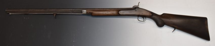 Unnamed 20 bore percussion hammer action gun with chequered semi-pistol grip, storage compartment to the stock, sling suspension loops, steel ram-rod and 30 inch smooth bored barrel, overall length 119cm.
