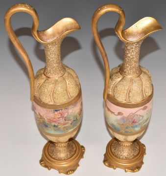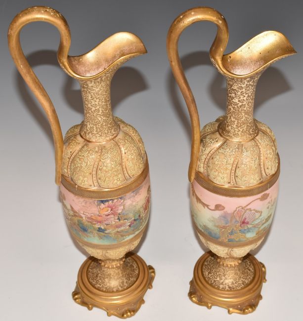 A pair of c1900 Royal Doulton pedestal ewers hand decorated with flowers, H 35cm