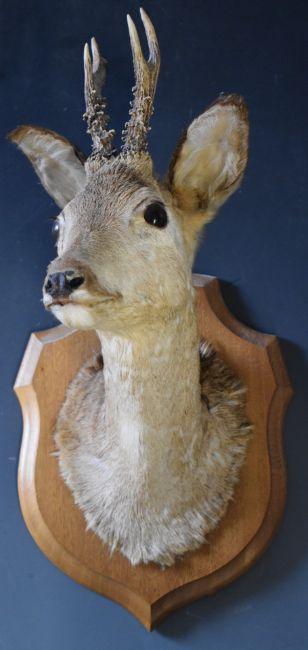 Taxidermy Roe deer head mounted on wooden shield, H58cm