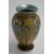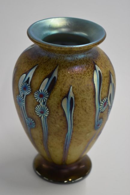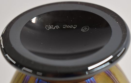Okra glass vase with iridescent stylised flowers, signed to base Okra 2002, 17cm tall.