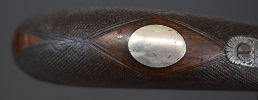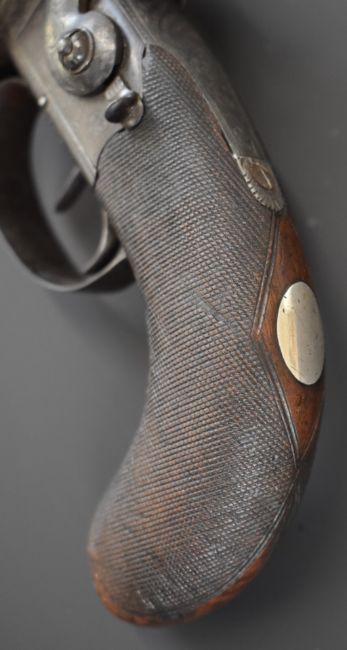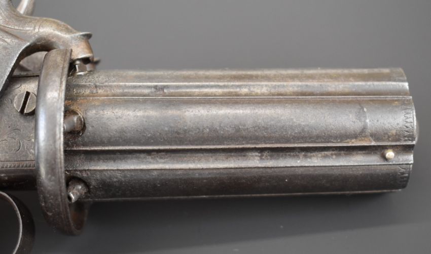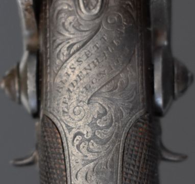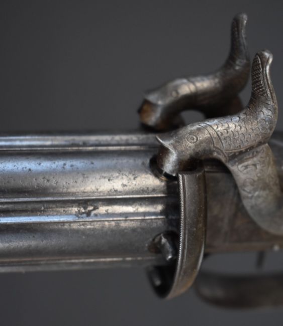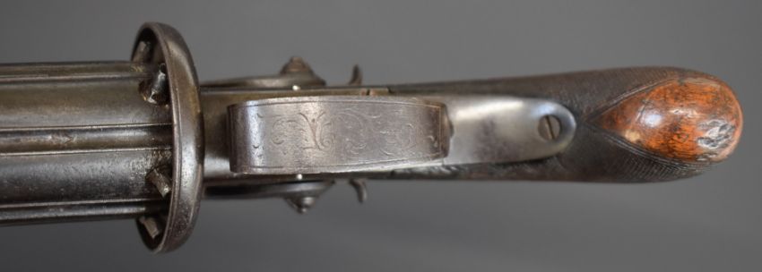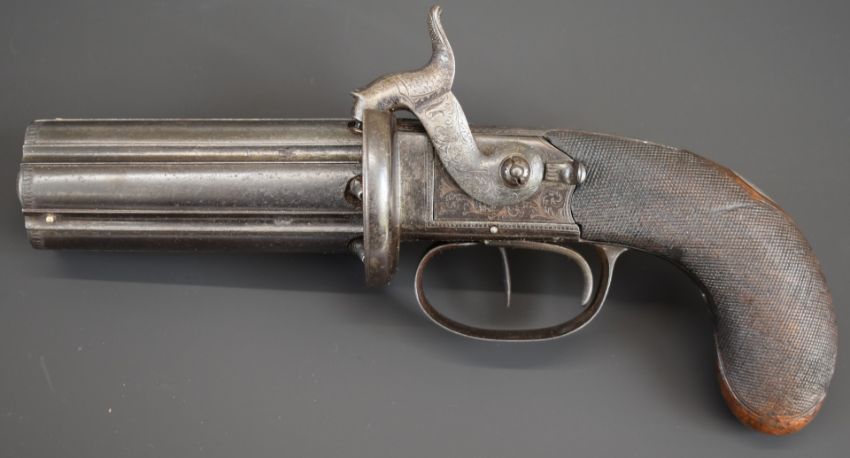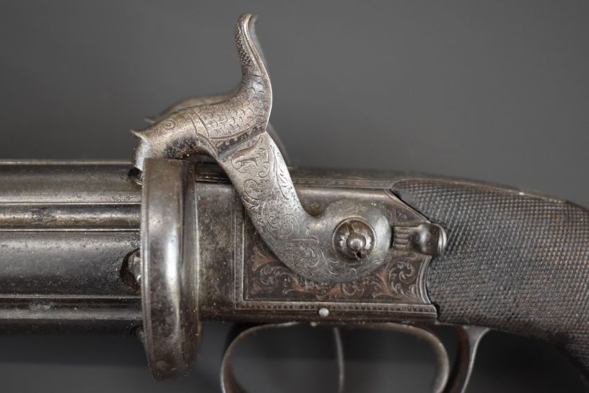 Blissett of London 88 bore six-shot side by side double hammer triple turnover percussion pepperbox pistol with double trigger, ornately engraved locks, top plate, stylised dolphin hammers and trigger guard, chequered grip, vacant wrist cartouche, top plate marked 'Blissett Leadenhall St London' and 3.5 inch barrels, overall length 23cm. One of only a small number produced with other known examples bearing the name Gogswell, Purdey, Lang or Lancaster.
