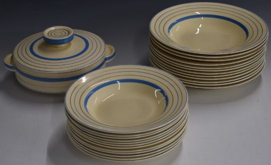 Approximately forty five pieces of Clarice Cliff for Wilkinson pottery Art Deco dinner ware including large tureen, two small tureens, graduated oval meat plates