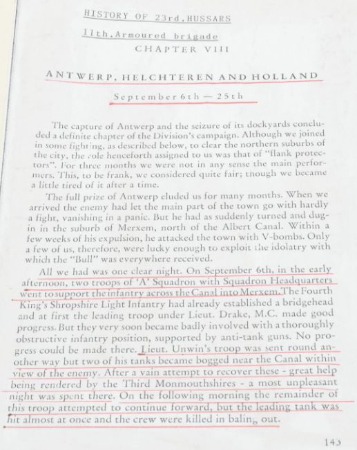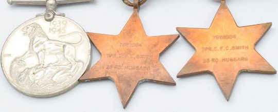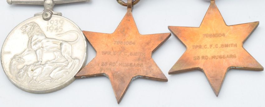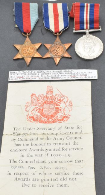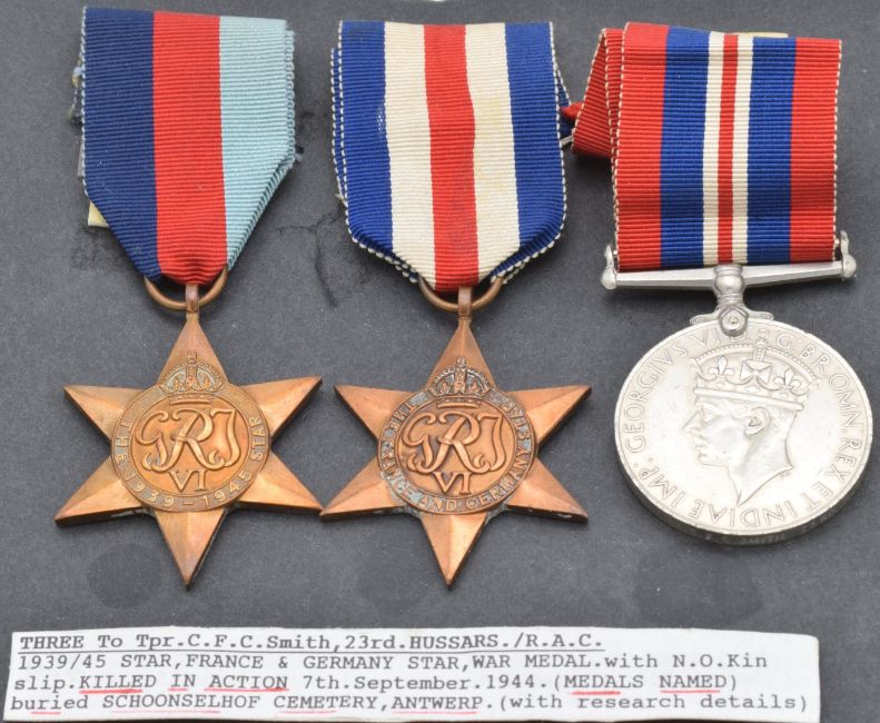British Army WW2 medals comprising 1939/1945 Star, France and Germany Star and War Medal, named to 7951004 Trooper C F C Smith, 23rd Hussars together with next of kin letter and copy paperwork. Trooper Smith was killed in action on the 7th September 1944
