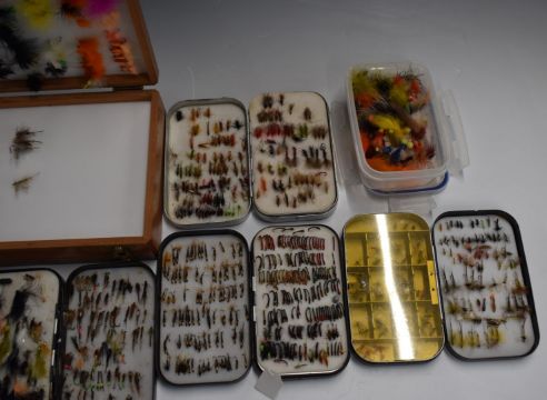 Seven fly fishing boxes, most Wheatley, with flies, some tied specifically for Blagdon or Chew reservoirs, to include extensive collection of nymphs, stillwater and dry, 300 plus wet, buzzers, lures, etc