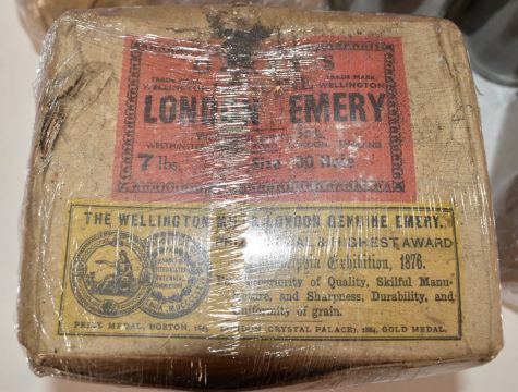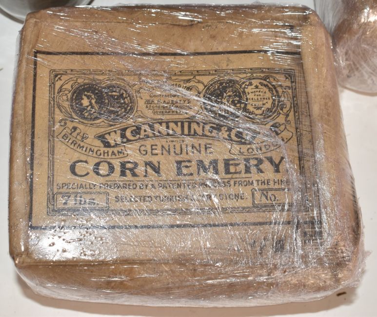 Approximately 56lb of 60, 70, 80 and 90 grade emery grit by Oakeys of London and Canning Birmingham, suitable for for boring shotgun barrels.