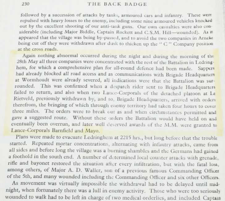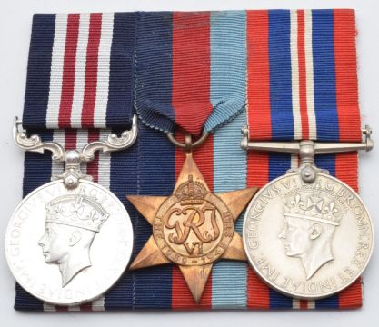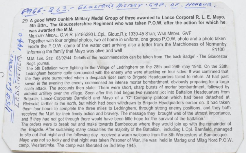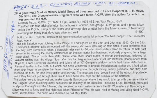 British Army WW2 Dunkirk 1940 Gloucestershire Regiment Military Medal group of three comprising Military Medal named to 5186290 L/Cpl R L E Mayo, 1939/1945 Star and Defence Medal. The 5th Battalion Gloucestershire Regiment were fighting in the French village of Ledringhem on the 28th and 29th May 1940. On the 28th Ledringhem became surrounded by the enemy who were attacking on four sides, and this was confirmed this when a dispatched rider sent to Brigade Headquarters failed to return. At half past seven in the evening the enemy commenced an intense mortar bombardment, obviously preparing for a large scale attack. The accounts then state: There were short, sharp bursts of mortar bombardment, followed by airburst artillery over the village. Soon after this had begun two runners got into Battalion Headquarters from Brigade, Lance-Corporals Barnfield and Mayo of a "C" Company platoon which had been detached at Reitweld, farther to the north, but which had been withdrawn to Brigade Headquarters earlier on. It had taken them four hours to complete the three miles to Ledringhem, through strong enemy positions, and they both received the M.M for their timely action and bravery. The message they brought was of the utmost importance, and if they had not got through there would have been little hope for survival of the Battalion. The orders were to break out and make towards Bambecque where they would join up with the remainder of the Brigade. After sustaining many casualties the majority of the Battalion, including L.Cpl. Barnfield, managed to slip out that night and the following day received a warm welcome from the 8th Worcesters at Bambecque. Mayo was not so lucky and that night was taken Prisoner of War and he was held in Marlag und Milag Nord P.O.W camp, Westertimke, which was liberated on 3rd May 1945. The lot inclues photos and paperwork