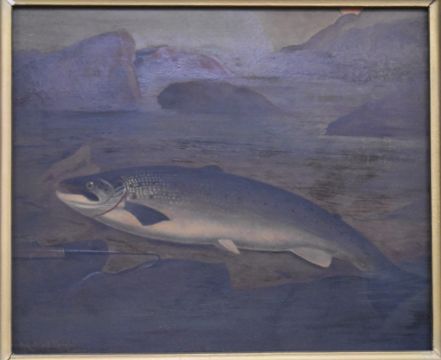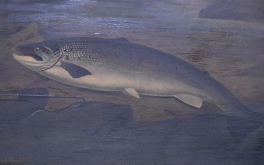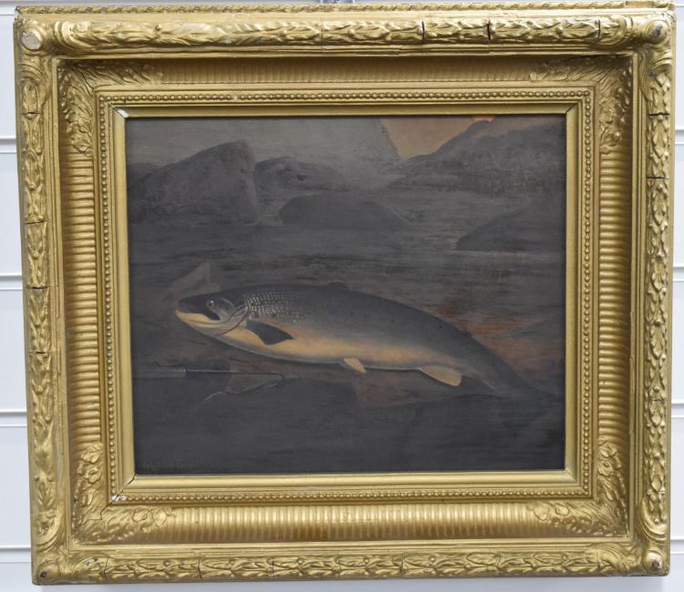A. Roland Knight (British,1879-1921) watercolour of a salmon having been caught, with river landscape beyond, signed lower left, 25 x 31cm, in ornate gilt frame