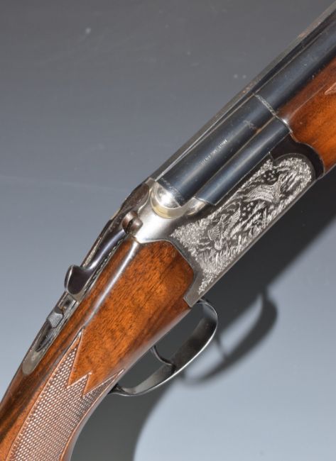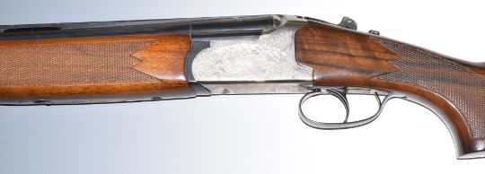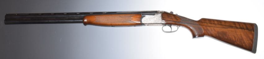 Lanber 12 bore over and under ejector shotgun with engraved scenes of birds to the locks and underside, scrolling engraving to the trigger guard and thumb lever, chequered semi-pistol grip and forend, vented top and central ribs, single trigger and 27.5 inch multi-choke barrels, overall length 112.5cm, length of pull 36.5cm, serial number 262649. PLEASE NOTE THAT A VALID RELEVANT FIREARMS/SHOTGUN CERTIFICATE IS REQUIRED TO HANDLE/PURCHASE THIS ITEM.