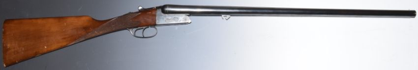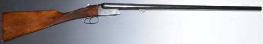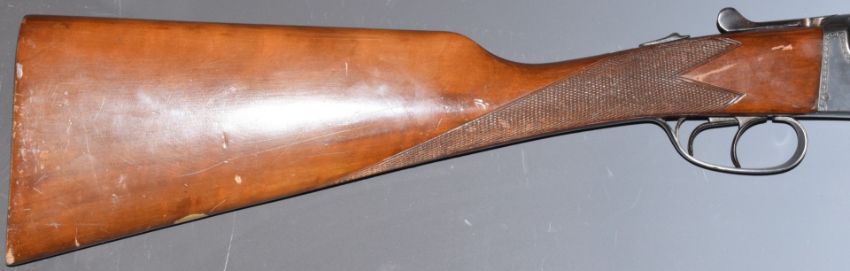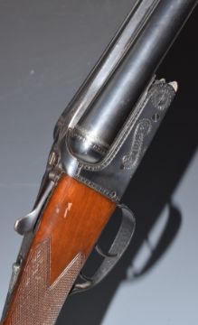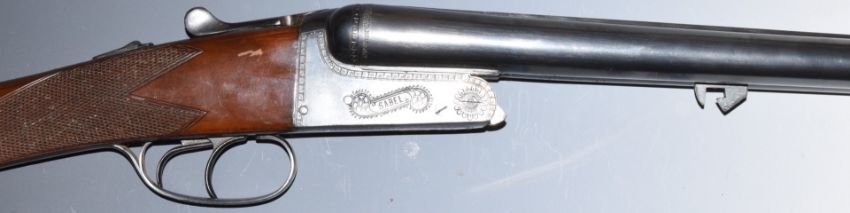 WITHDRAWN   Sabel 12 bore side by side ejector shotgun with engraved locks, underside, trigger guard, top plate and thumb lever, double trigger, chequered grip, vacant cartouche to the underside of the stock, double trigger and named 27 inch barrels choked ¼ and improved cylinder, overall length 113cm, length of pull 38cm, serial number PG93771. PLEASE NOTE THAT A VALID RELEVANT FIREARMS/SHOTGUN CERTIFICATE IS REQUIRED TO HANDLE/PURCHASE THIS ITEM.