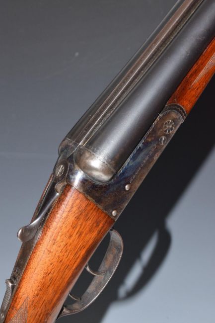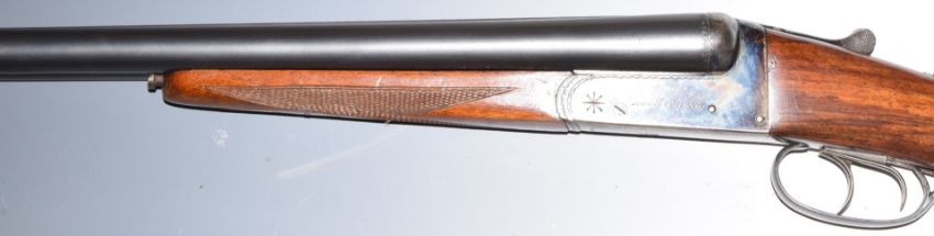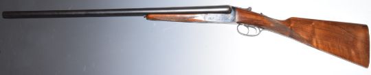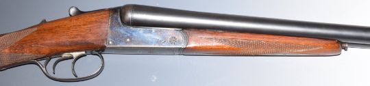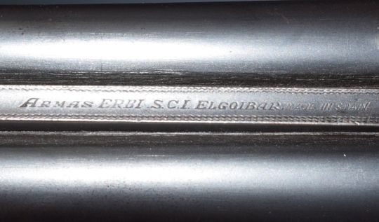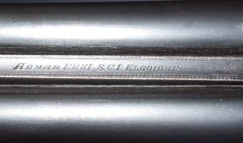 Armas Erbi 12 bore side by side shotgun with chequered grip and forend, named locks, double trigger and 27.5 inch barrels choked full and ½ and engraved 'Armas Erbi S.C.I. Elgoibar', overall length 113cm, length of pull 36.5cm, serial number 20514. PLEASE NOTE THAT A VALID RELEVANT FIREARMS/SHOTGUN CERTIFICATE IS REQUIRED TO HANDLE/PURCHASE THIS ITEM.