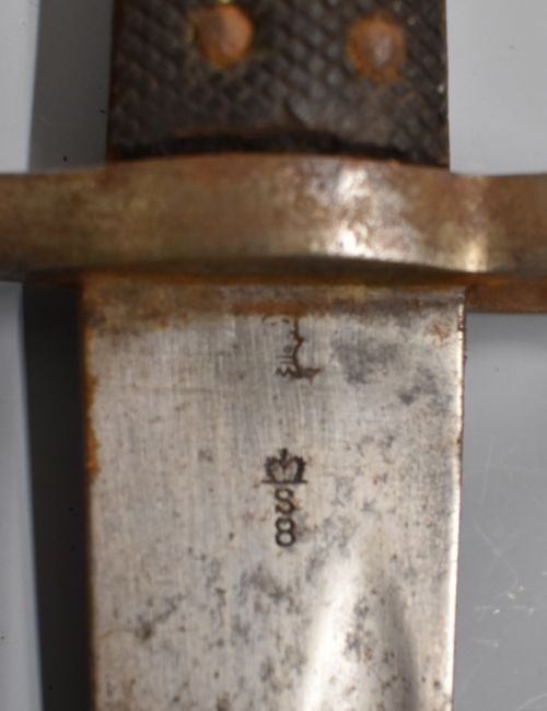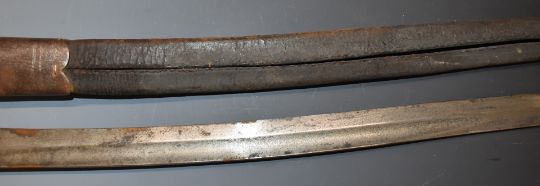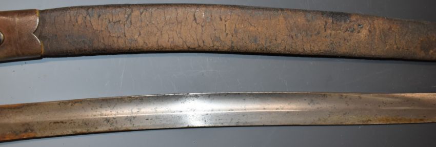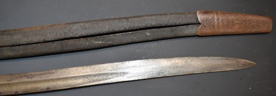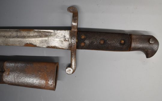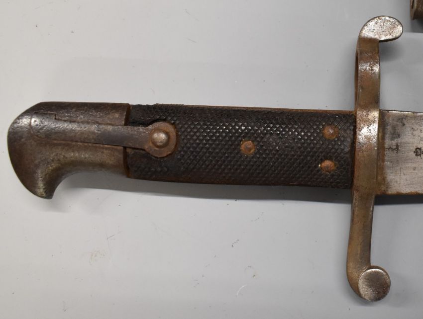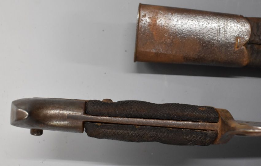 British 1856 pattern Enfield sword bayonet with early type leaf spring secured by rivet, some clear stamps to ricasso, 58cm Yataghan blade and scabbard