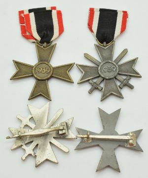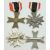 Four German WW2 Third Reich Nazi War Merit Cross medals, two with crossed swords, one stamped 3 to reverse