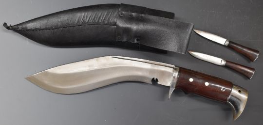 Large Kukri in scabbard and two smaller examples
