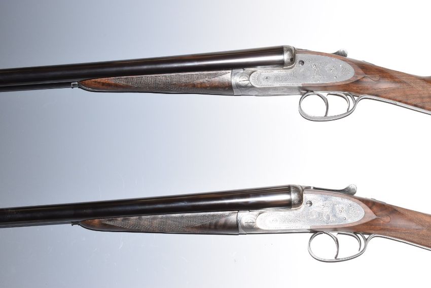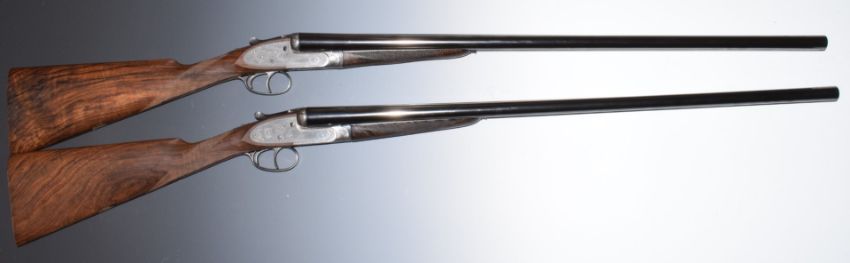 A pair of James Purdey & Sons 12 bore self-opening sidelock side by side ejector shotguns, each with fine rose and scroll engraving to the locks, underside, trigger guard, fences, top plate and thumb lever, chequered grip and forend, carved teardrop to the wrist, double trigger and named 30 inch barrels choked ½ and cylinder, overall lengths 119cm, each length of pull 38cm, serial numbers 22811 and 22812. Built in 1925 for Lord Ramsey and presented to him on the 25th July 1925, the gold cartouche to the underside of the stock on gun No.1 reads 'Presented To Lord Ramsey On His Coming Of Age By The Tenants On The Brechin Estate 25th July 1925' and the matching cartouche on gun No.2 reading  'Presented To Lord Ramsey On His Coming Of Age By The Tenants On The Panmure Estate 25th July 1925'. The guns are accompanied by a history certificate from James Purdey & Sons confirming the provenance and listing the details of the gun on completion and work carried out at a later date. PLEASE NOTE THAT A VALID RELEVANT FIREARMS/SHOTGUN CERTIFICATE IS REQUIRED TO HANDLE/PURCHASE THIS ITEM.