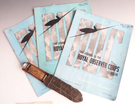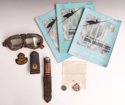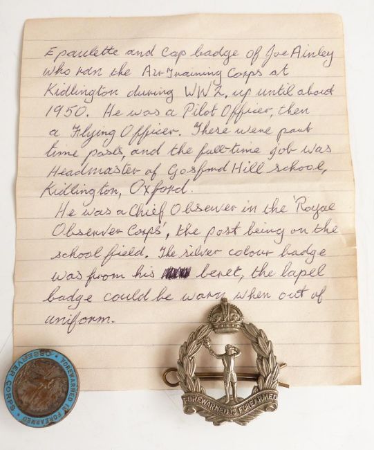 Small collection of WW2 Royal Air Force and Royal Observer Corps memorabilia including badges, goggles etc, attributed to Joe Ainley, with hand written note explaining that Mr Ainley was the headmaster of Gosford Hill School in Kidlington Oxford prior to WW2