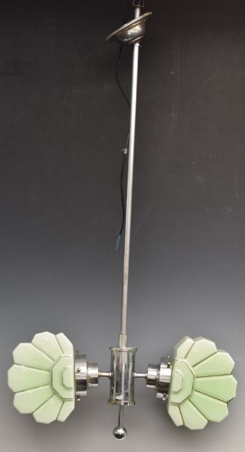 Art Deco ceiling light with two fan shaped green glass shade and chrome fittings, 83cm tall.