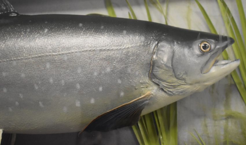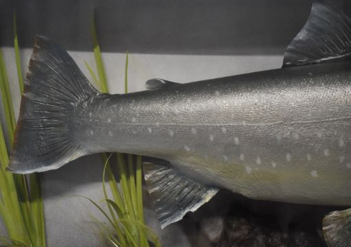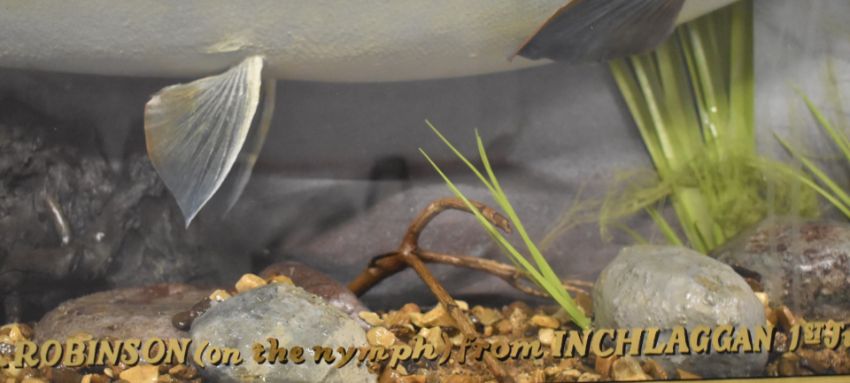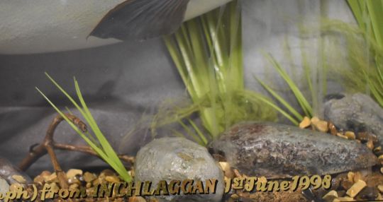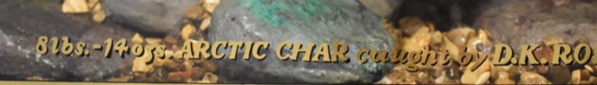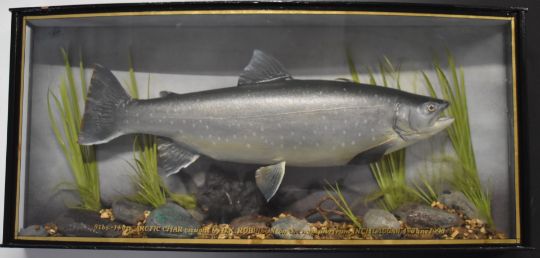 Taxidermy study of an Arctic char in glazed bow fronted case with gilt script '8lbs-14oz. Arctic Char Caught by D K Robinson (on the nymph) from Inchlaggan, 1st June 1998'. Please note this is an exceptionally large char, the UK record is currently 9lb 8oz. Taxidermist label to case C J Elliot, W87 x D175 x H41cm