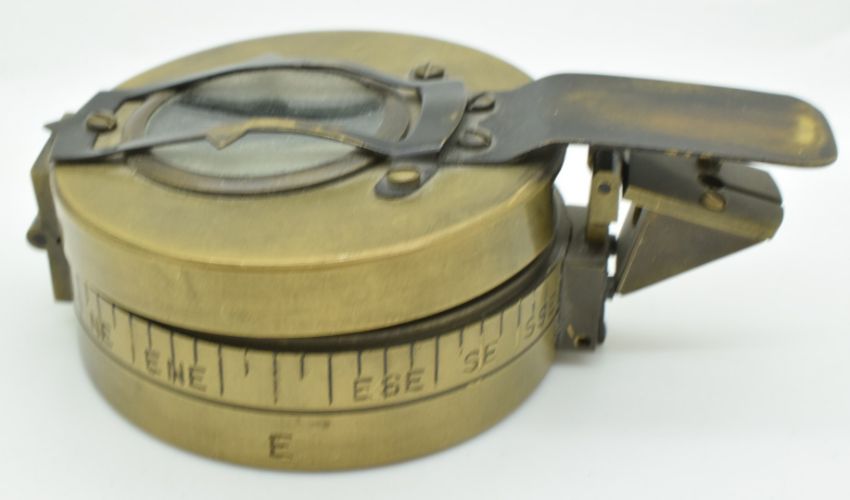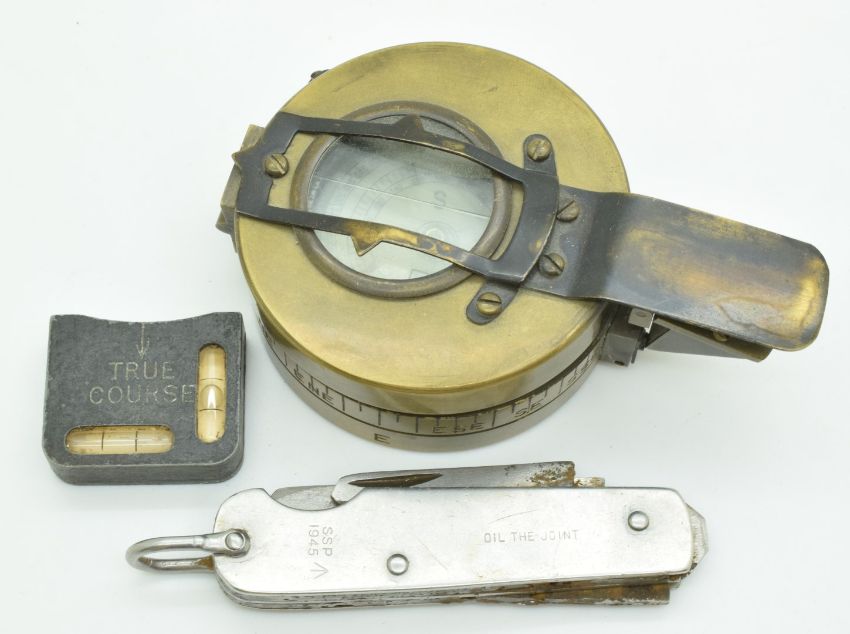 WW2 compass with T G Co Ltd London Mk III dated 1941, together with a small navigational aid and a WW2 clasp knife with broad arrow mark dated 1945