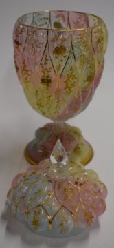 Late 19thC candy striped lidded glass urn with bulbous body and gilt and enamel decoration, probably Moser, 31cm tall.