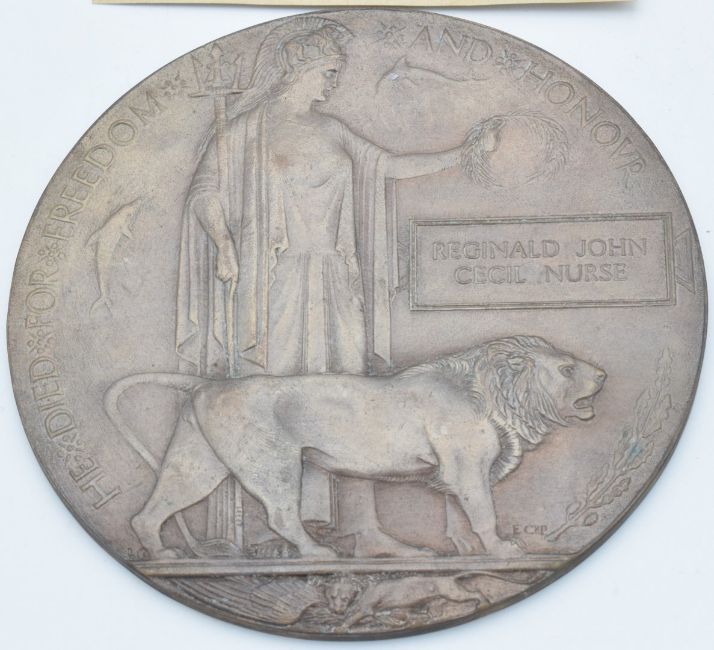 WW1 Memorial Plaque / Death Penny for Reginald John Cecil Nurse 2nd Lieutenant Gloucestershire Regiment, killed in action 22/3/1918, with paperwork