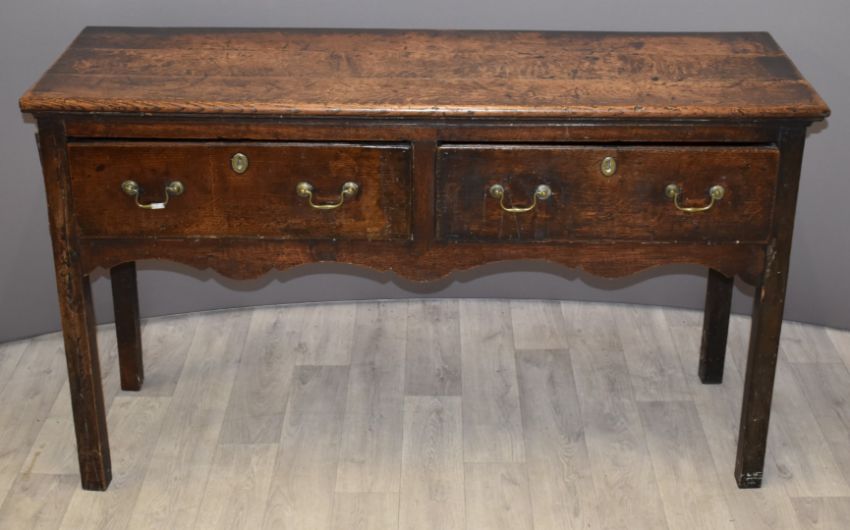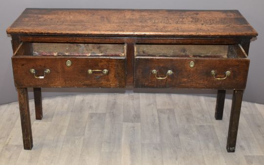 Early 19thC country oak sideboard with three drawers and shaped front stretcher, W137 x D46 x H79cm