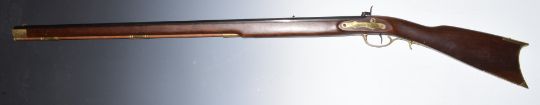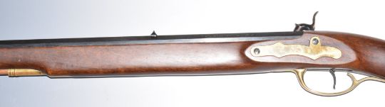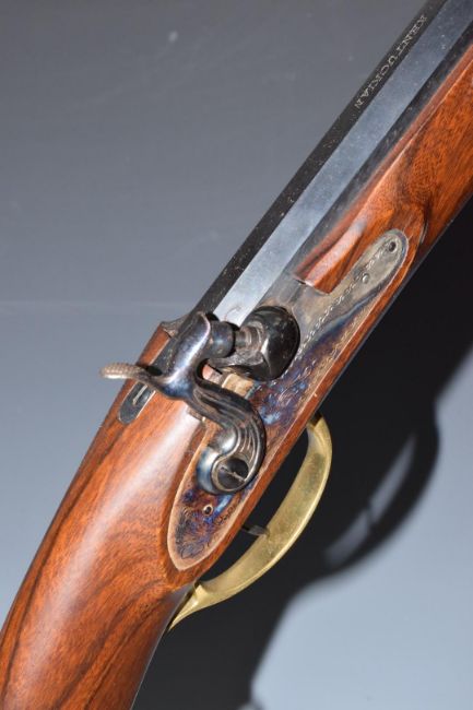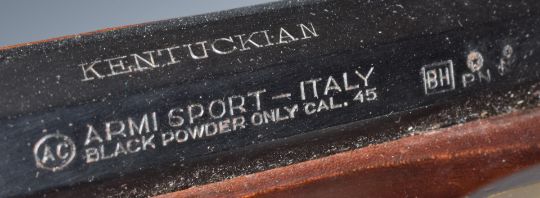 Armi Sport .45 percussion hammer action Kentucky rifle with brass shaped trigger guard, stock storage compartment, butt plate and mounts, engraved lock and hammer, brass tipped wooden ram-rod and 35 inch octagonal barrel engraved 'Kentuckian', overall length 129cm, serial number 50930. PLEASE NOTE THAT A VALID RELEVANT FIREARMS/SHOTGUN CERTIFICATE IS REQUIRED TO HANDLE/PURCHASE THIS ITEM.