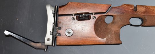 A fully adjustable wooden target rifle stock.