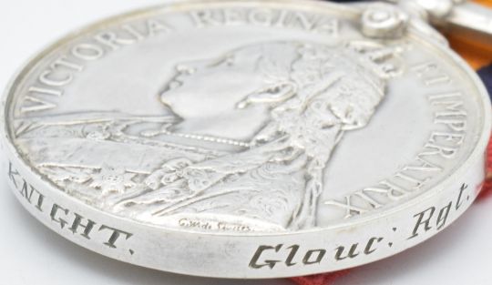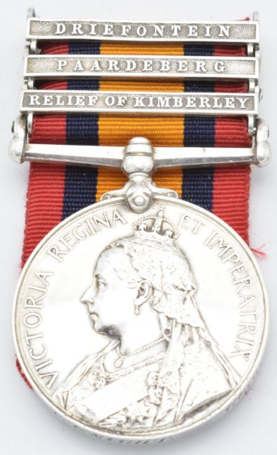 British Army Queen's South Africa Medal 1899 with clasps for Relief of Kimberley, Paardeberg and Drifontein, named to 2721 Sergeant T Knight Gloucestershire Regiment