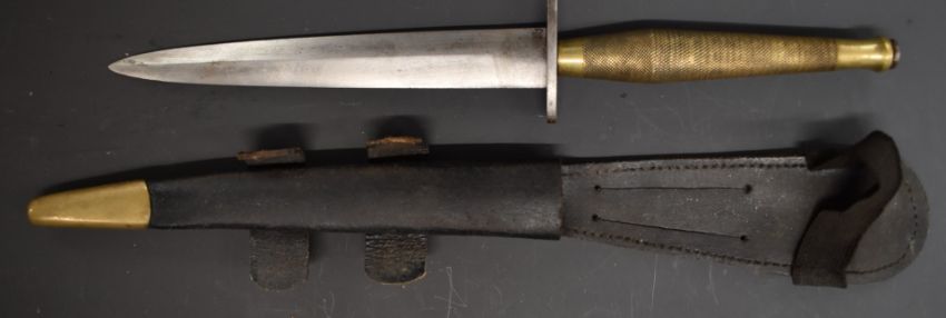 Indian Fairbairn Sykes 2nd pattern Commando fighting knife with 7 inch double edged blade, straight crossguard stamped I below a crowned arrow and brass handle stamped 6 below a crowned arrow, in brass tipped leather scabbard, overall length 31cm.