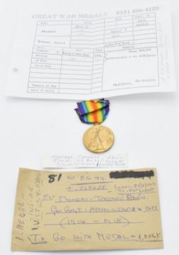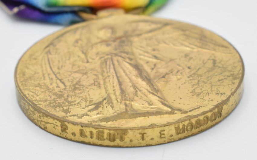 British Army WW1 Victory Medal named to 2nd Lieutenant T E Monday, Gloucestershire Regiment, with copy medal index card